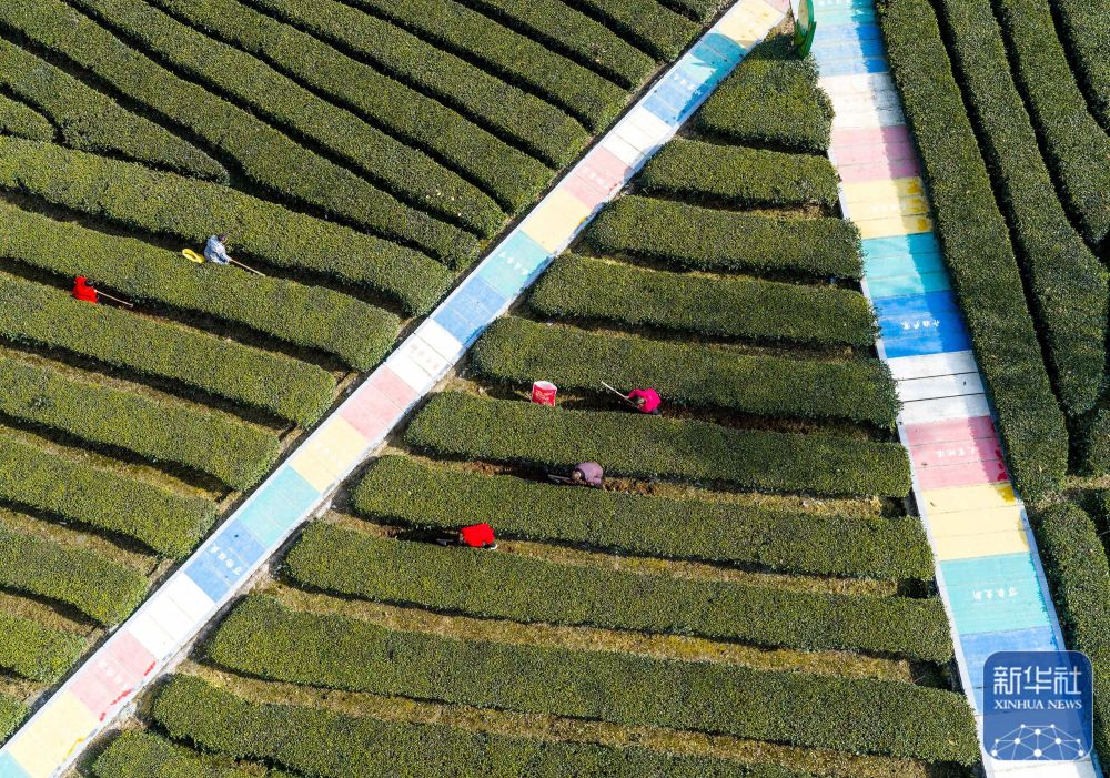↑ 12月16日,湖北省秭归县茅坪镇花果园村村民对茶园进行翻耕深施有机肥(无人机照片)。新华社发(王罡摄)