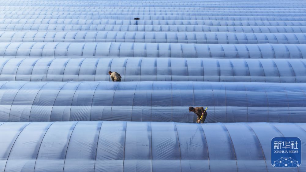 ↑ 12月16日,在山东省东营市广饶县李鹊镇,农民在搭建拱棚(无人机照片)。新华社发(刘云杰摄)