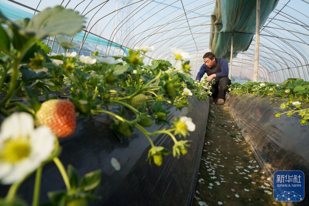 ↑ 12月16日,农民在山东省滨州市博兴县湖滨镇柳童村大棚里采摘草莓。新华社发(陈彬摄)