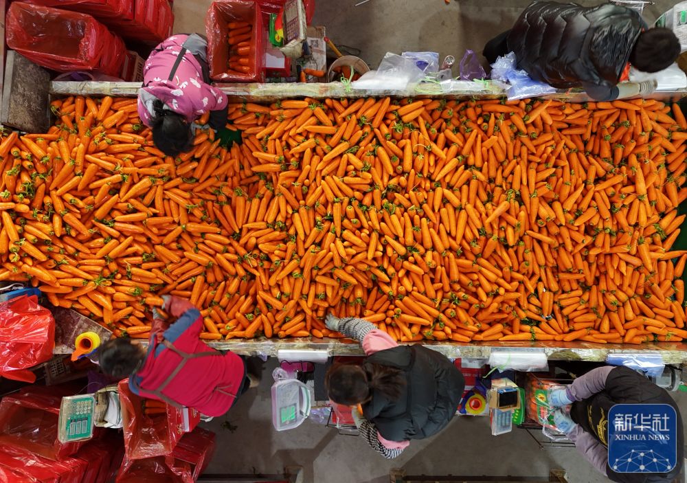 ↑ 12月16日,河南省焦作市温县东张王庄村村民在分装胡萝卜(无人机照片)。新华社发(黄福兴摄)