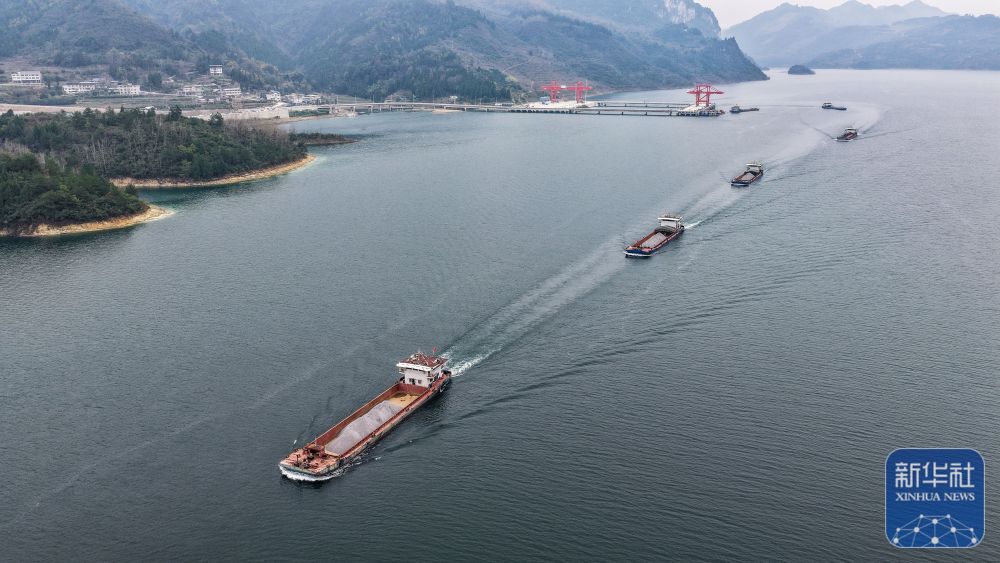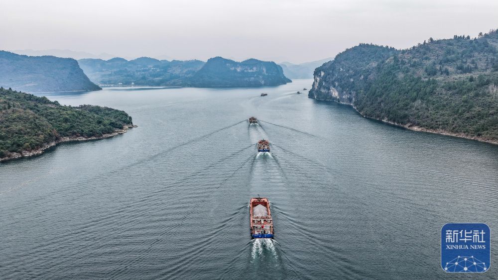 ↑ 12月16日,货船从瓮安港云中港区启运出发(无人机照片)。