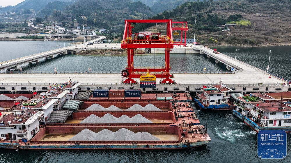 12月16日,随着汽笛长鸣,桥式起重机将装有沉淀硫酸钡的集装箱吊入货船准备起运,贵州省首个自动化港口——瓮安港云中港区正式开港。