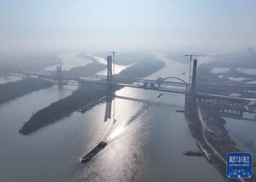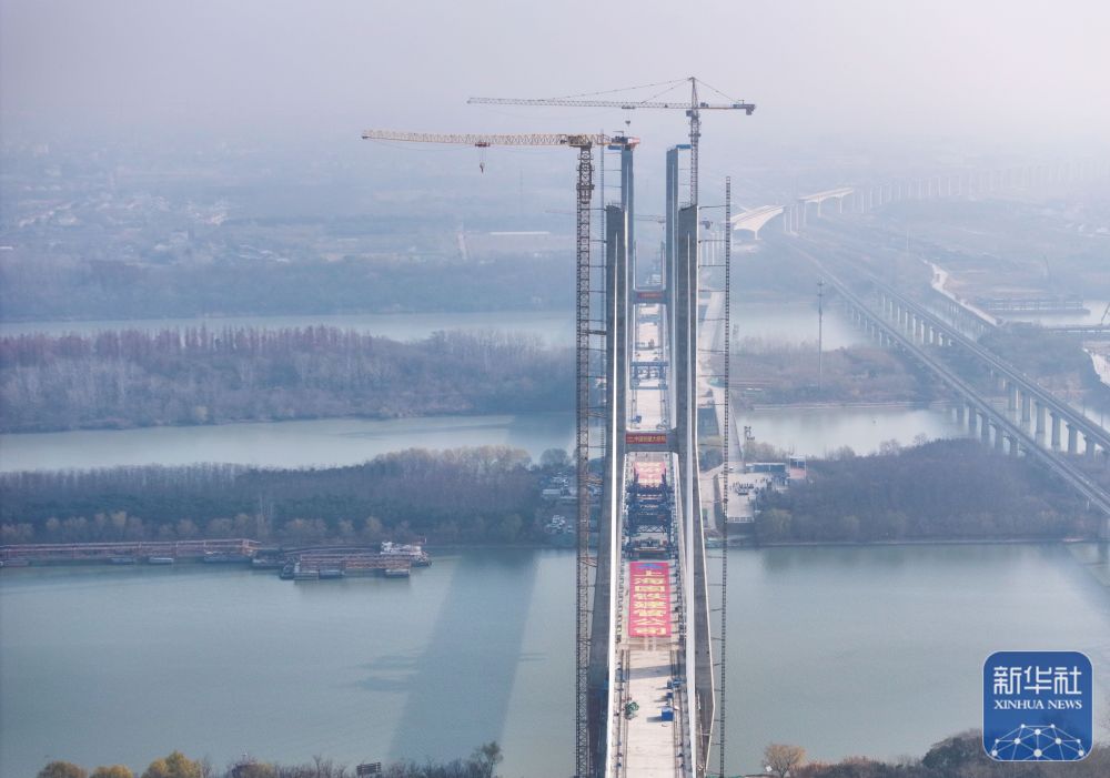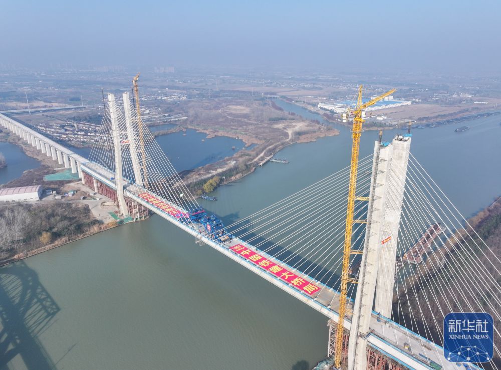 ↑ 12月19日拍摄的通泰扬特大桥跨京杭运河斜拉桥合龙施工现场(无人机照片)。