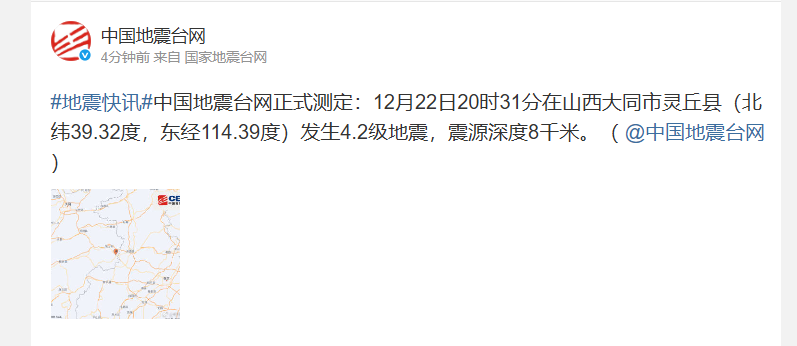 中国地震台网正式测定:12月22日20时31分在山西大同市灵丘县(北纬39.32度,东经114.39度)发生4.2级地震,震源深度8千米。
