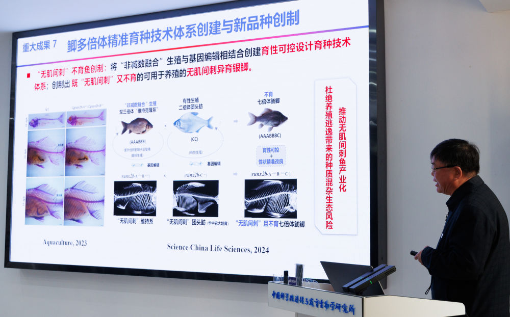 ↑12月22日,在中国科学院遗传与发育生物学研究所举行的发布会上,中国科学院院士、中国科学院水生生物研究所研究员桂建芳在介绍研究成果。