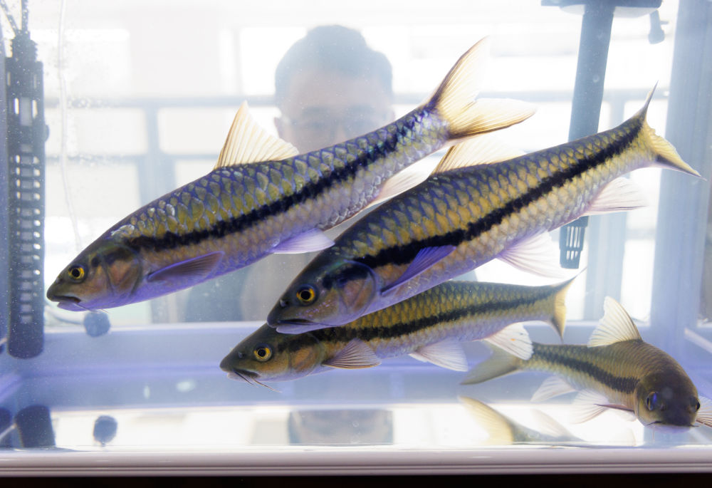 ↑这是发布会现场展示的软鳍新光唇鱼“墨龙1号”(12月22日摄)。