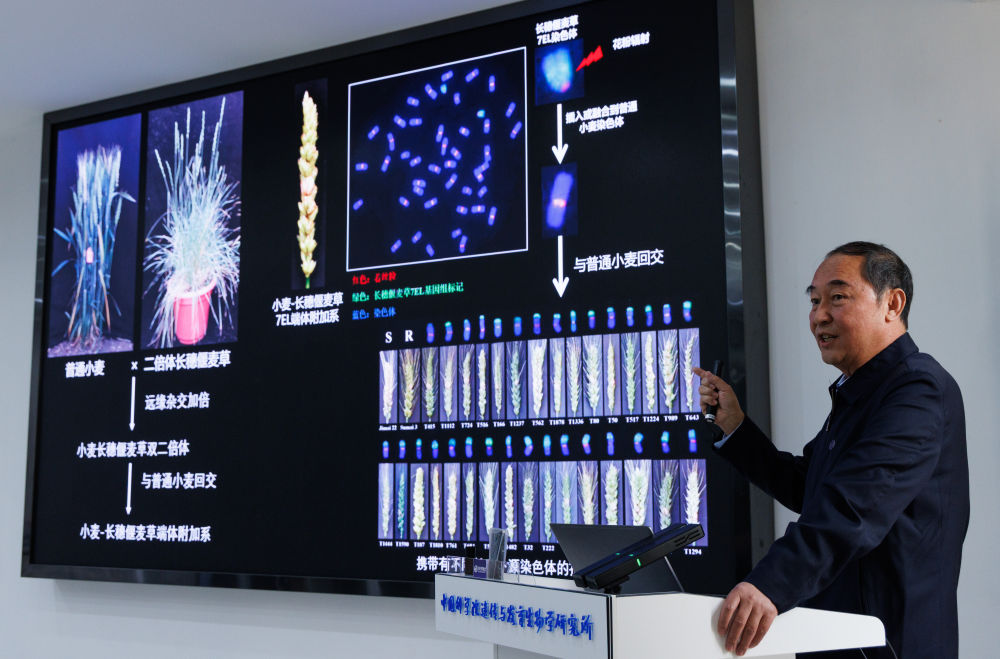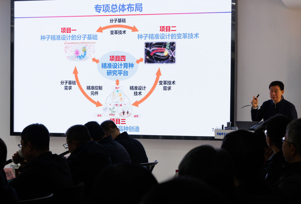 ↑12月22日,在中国科学院遗传与发育生物学研究所举行的发布会上,“种子专项”首席科学家、中国科学院院士李家洋在介绍专项整体实施情况。