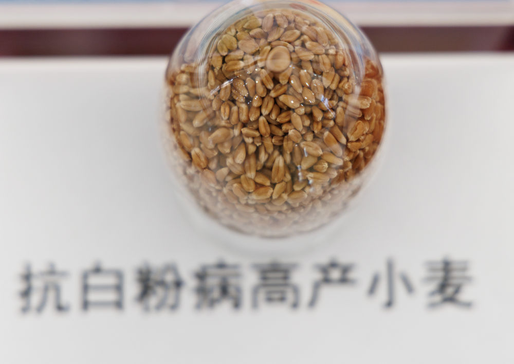↑这是发布会现场展示的抗白粉病高产小麦(12月22日摄)。