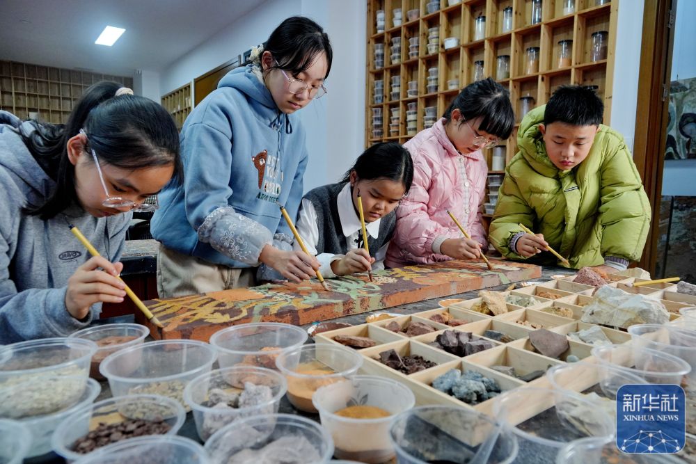 ↑ 12月20日,参加武夷山市文化馆岩彩画公益课程的孩子们在合作创作岩彩作品。新华社发(陈颖 摄)