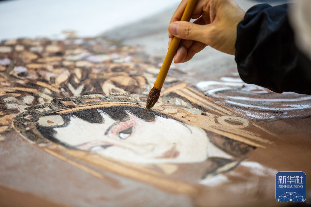 ↑ 12月21日,武夷市文化馆内,画师在绘制岩彩画。新华社发(陈颖 摄)