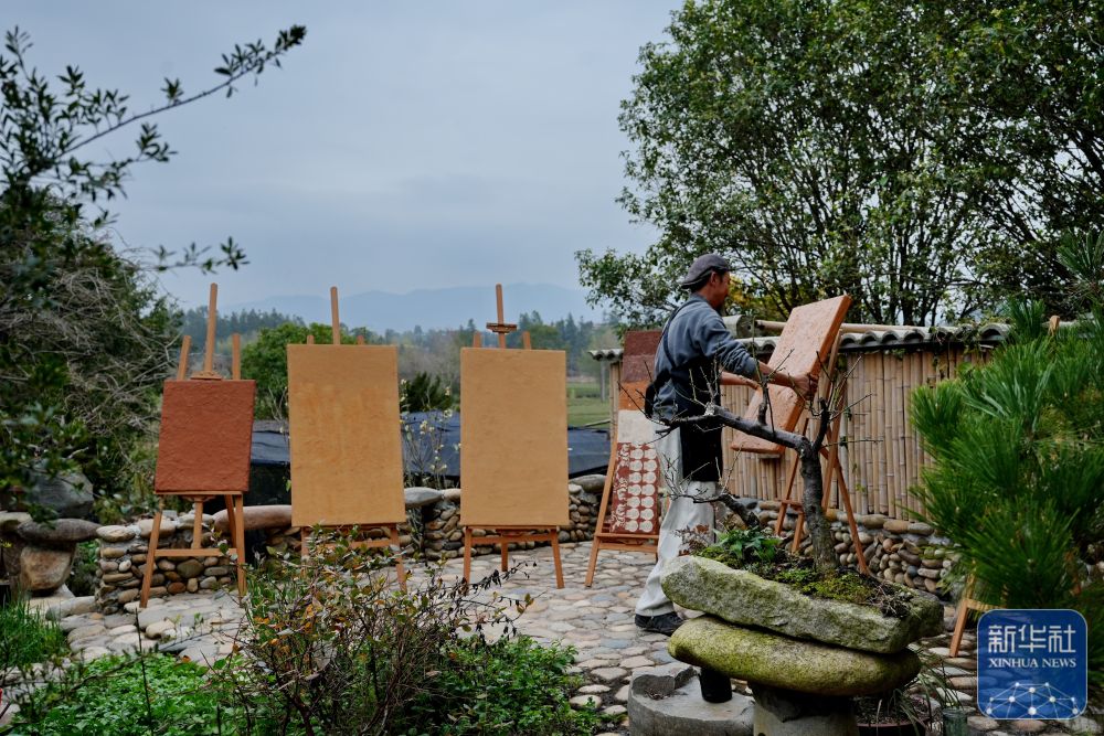 ↑ 12月22日,武夷岩彩画师胡磊在制作岩彩画板。新华社发(陈颖 摄)