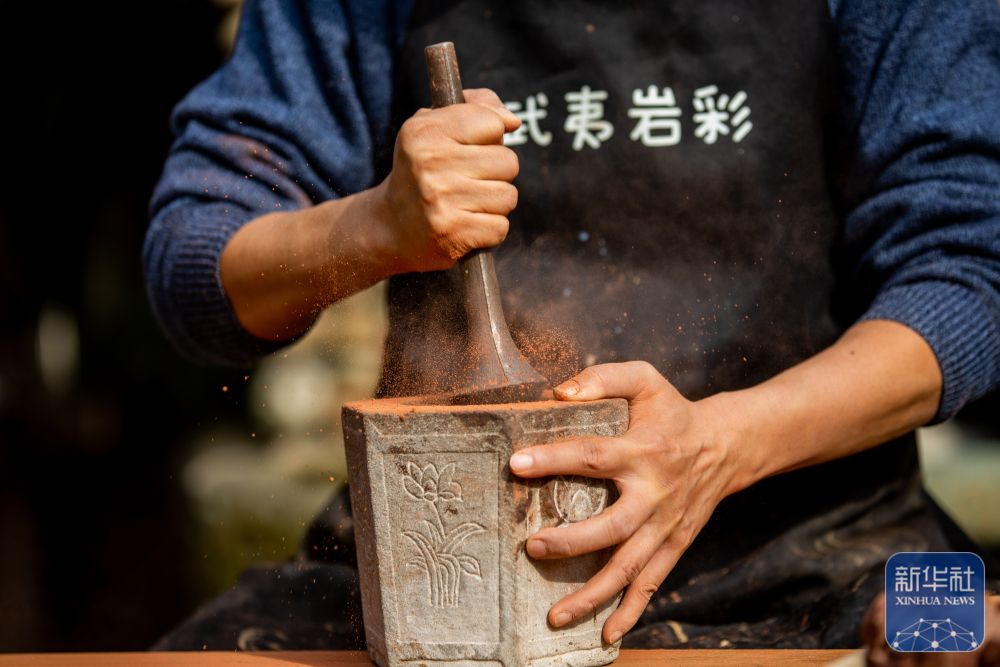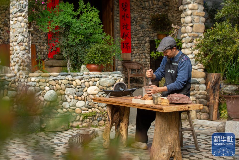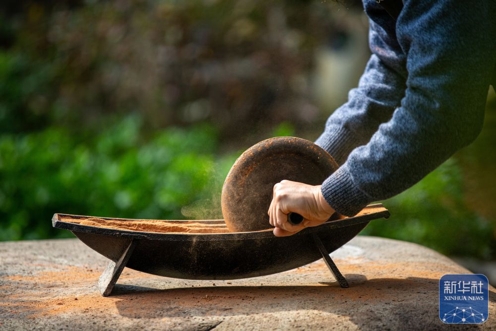 ↑ 12月19日,武夷岩彩画师胡磊将采集回的岩土碾碎研磨成粉。新华社发(陈颖 摄)