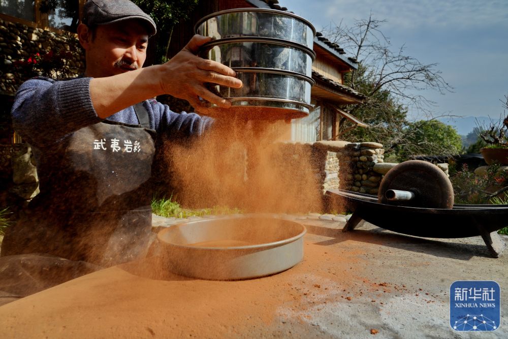 ↑ 12月19日,武夷岩彩画师胡磊过筛研磨后的岩土粉末。新华社发(陈颖 摄)