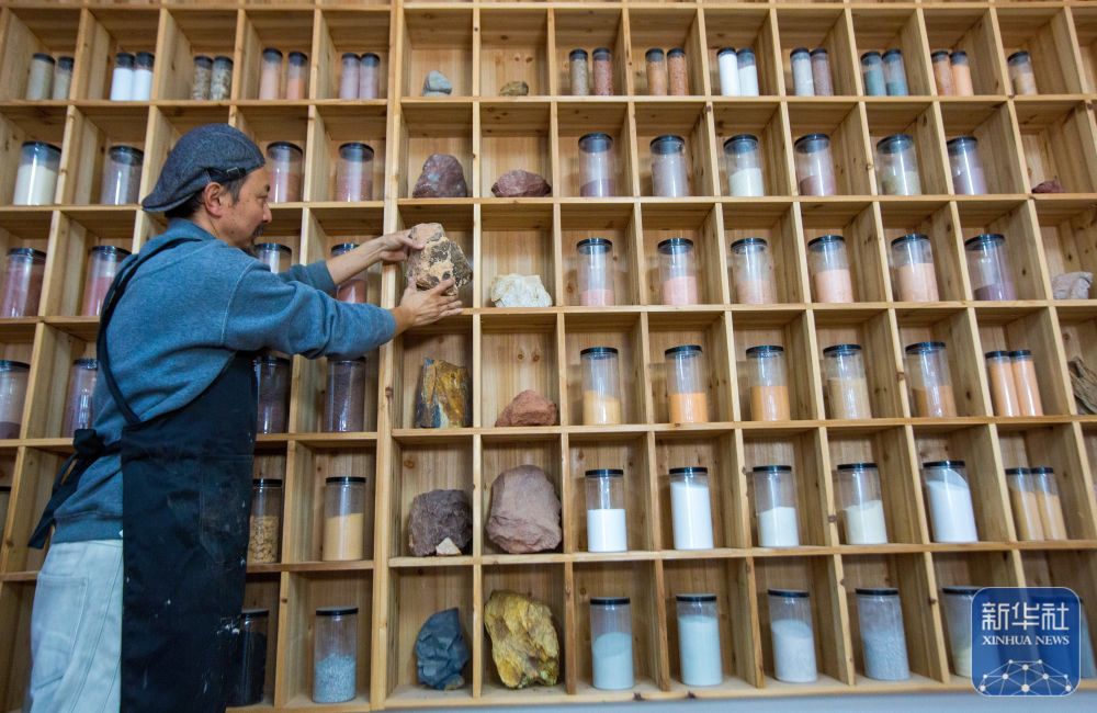 ↑ 这是12月22日拍摄的武夷山市文化馆内排列整齐的岩彩原料。新华社发(陈颖 摄)