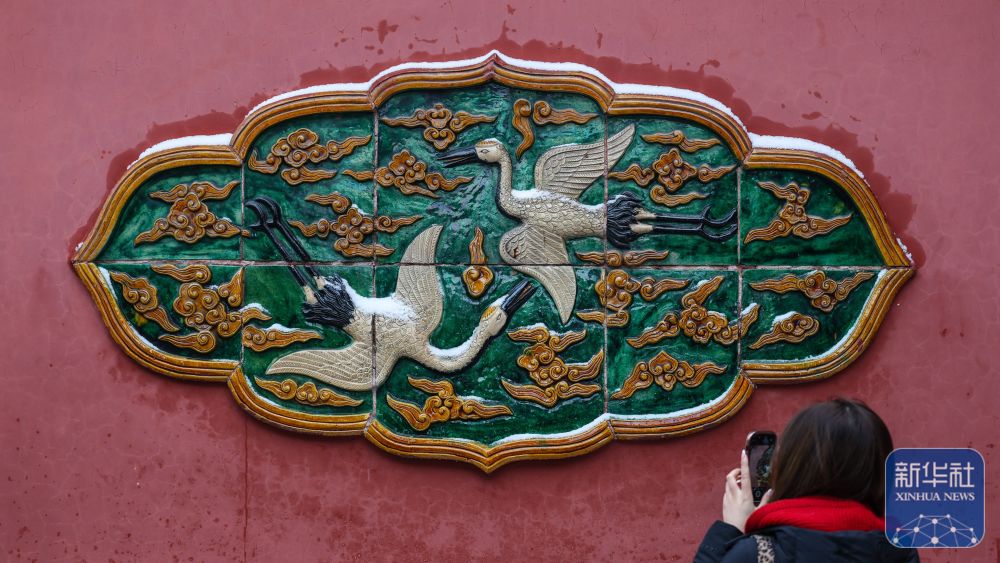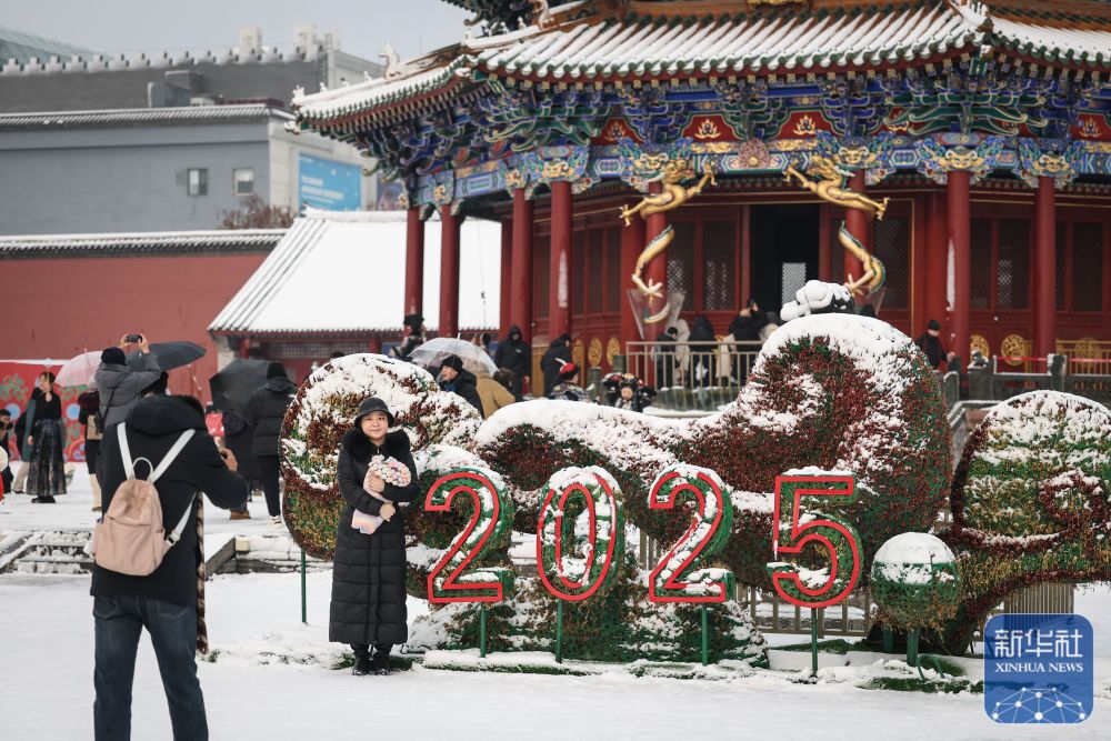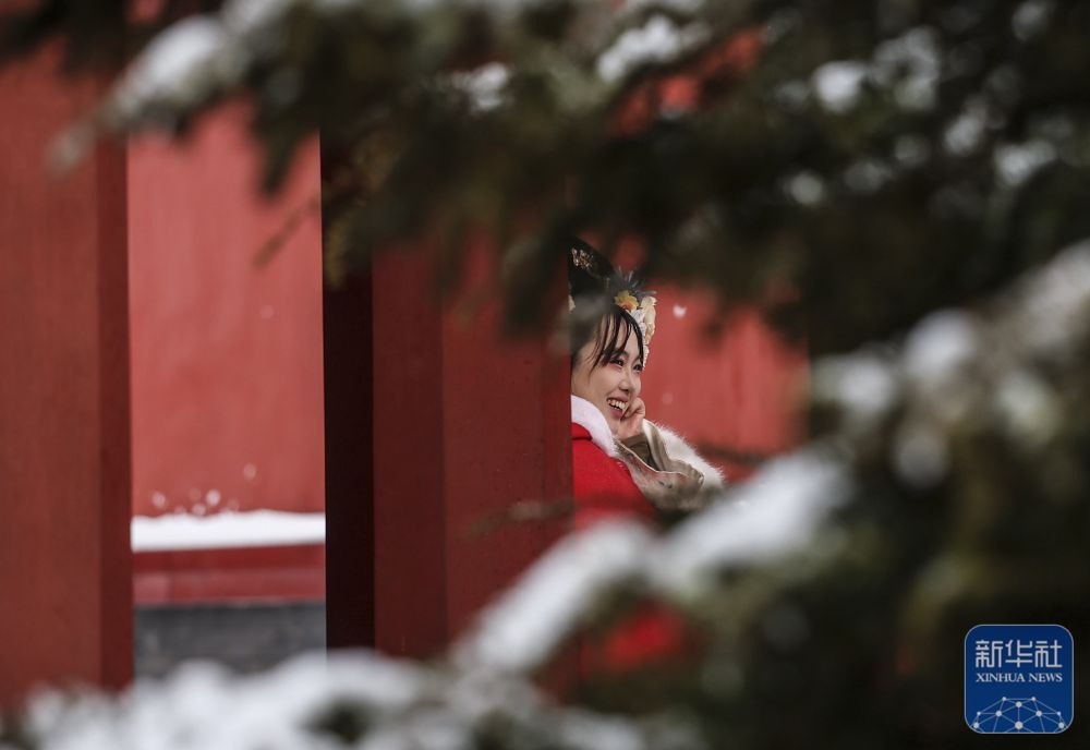 ↑ 12月23日,游客在沈阳故宫博物院外拍照。