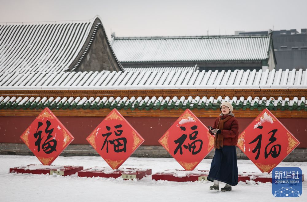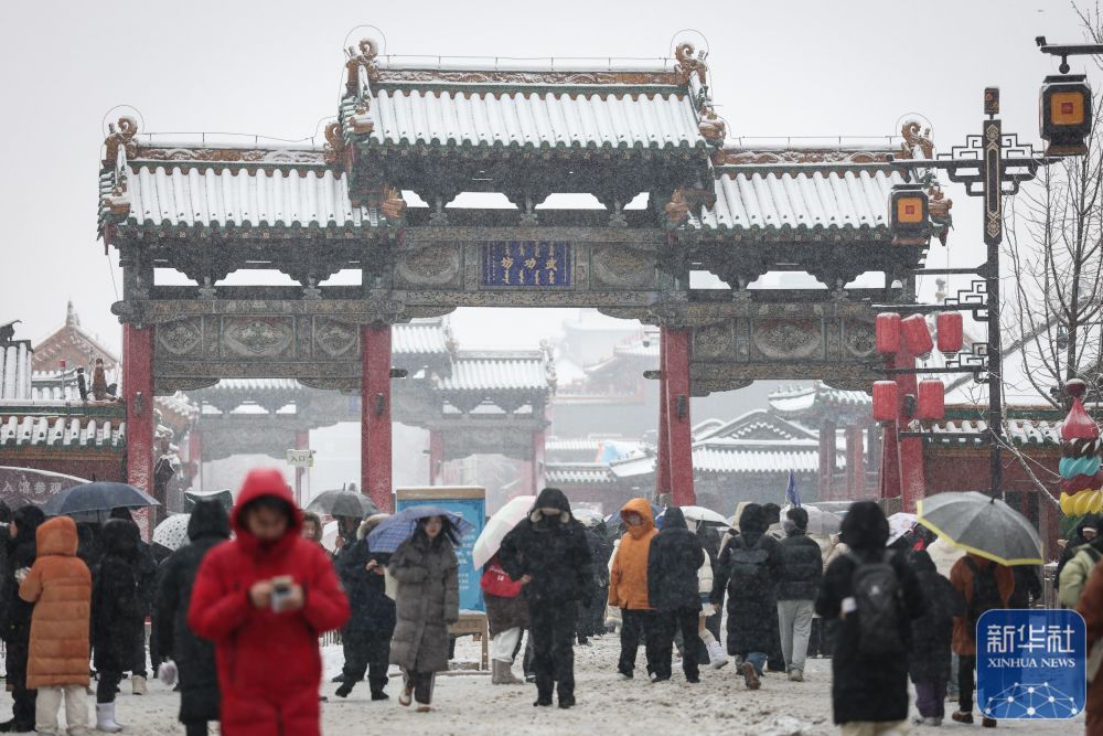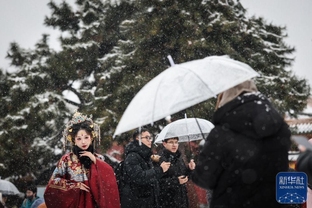 ↑ 12月23日,在沈阳故宫博物院外,人们在雪中出行。