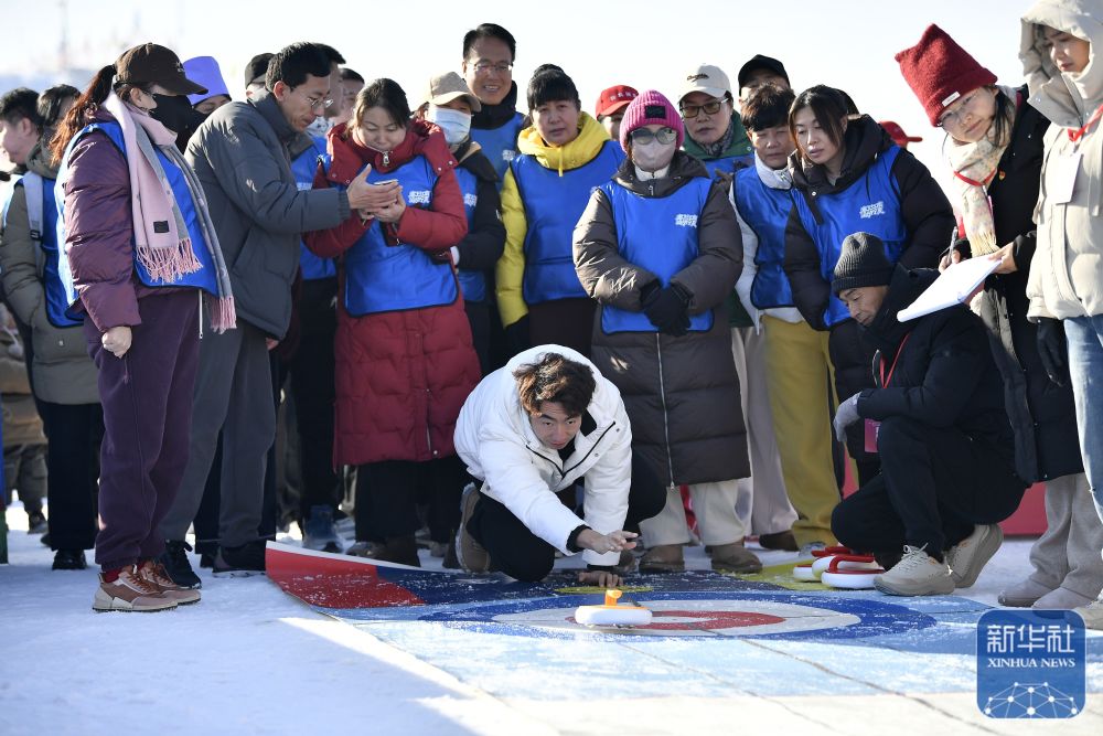 ↑ 12月27日,参赛选手在银川阅海滑雪场参加冰壶比赛。新华社发(李靖 摄)