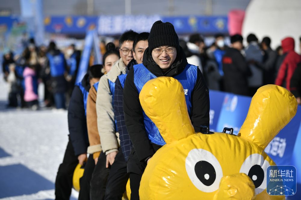 ↑ 12月27日,参赛选手在银川阅海滑雪场参加雪地趣味项目比赛。新华社发(李靖 摄)