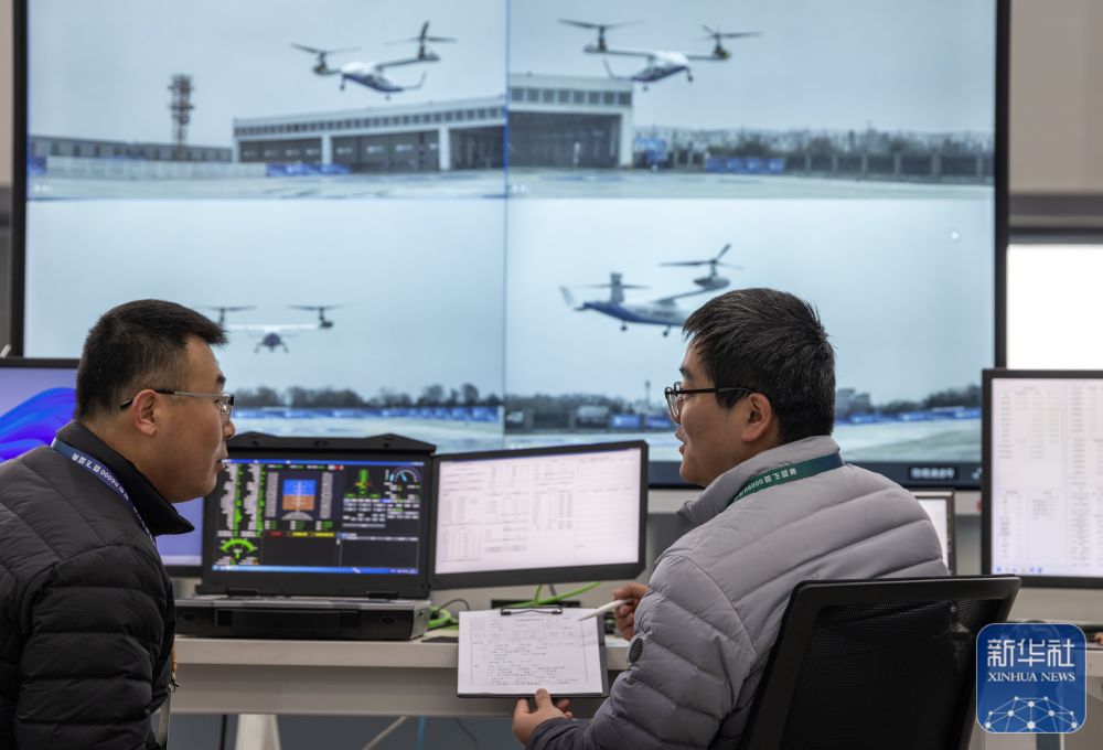 ↑12月28日,科研人员在操控工作台监控无人倾转旋翼飞行器“镧影R6000”的飞行。