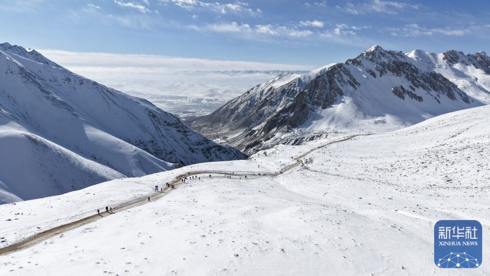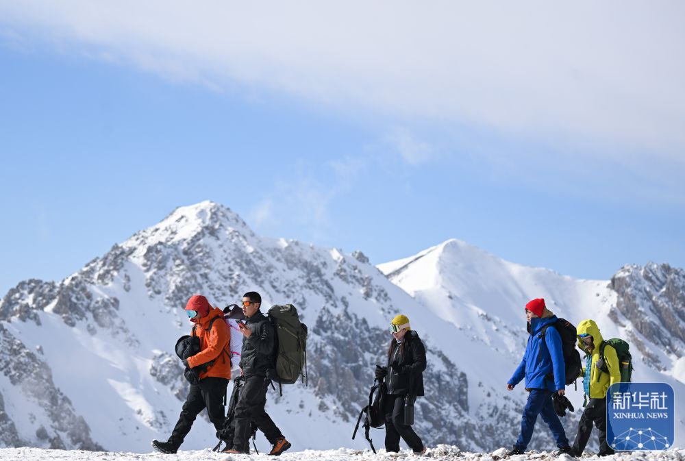 1月1日,在青海省海北藏族自治州门源回族自治县,登山爱好者们攀登岗什卡雪峰,在山巅与雪原间度过新年第一天。