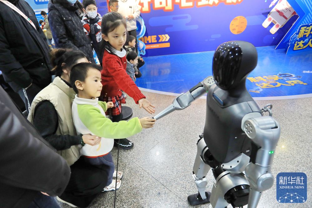 ↑ 1月2日,在浙江省嘉兴市科技馆,小朋友在“新质生产力·未来新引擎”科普主题展上与人形机器人互动。新华社发(金鹏摄)