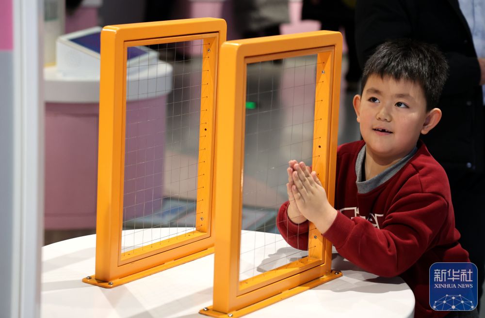 ↑ 1月2日,小朋友在山东省滨州市科技馆体验“天鹅绒触觉”项目。新华社发(初宝瑞摄)