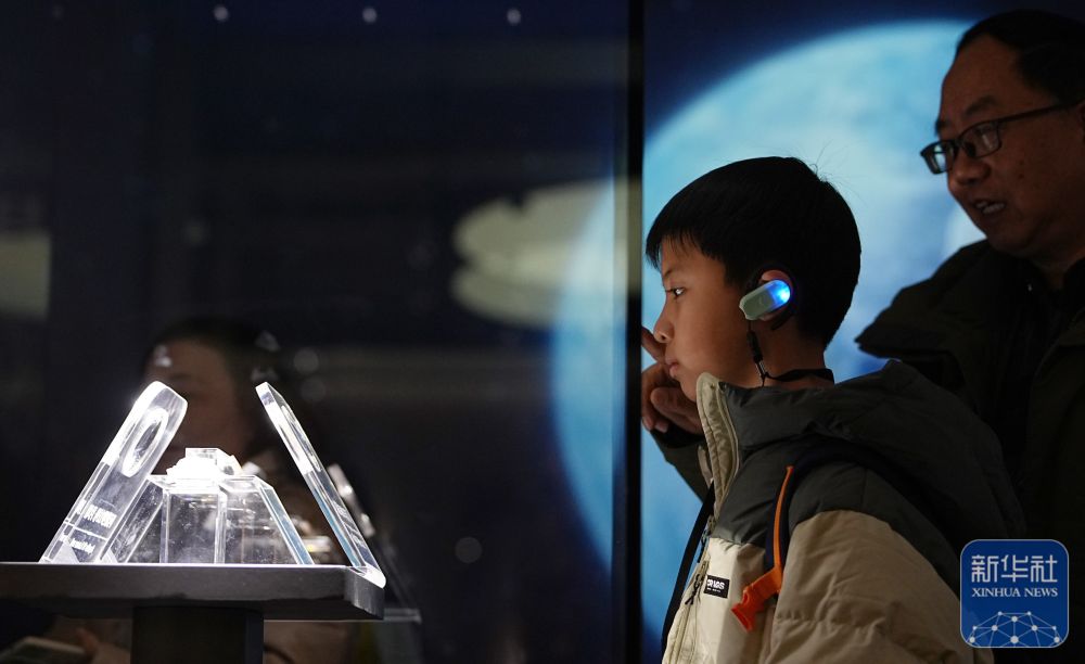 ↑ 1月2日,游客在河北地质大学博物馆参观月壤。新华社发(闫志国摄)