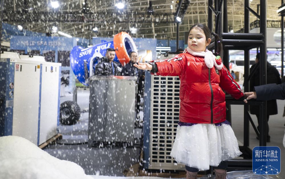 1月6日,在2026哈尔滨国际冰雪经济博览会冰雪装备展区,小朋友触摸制雪机现场制造的雪花。