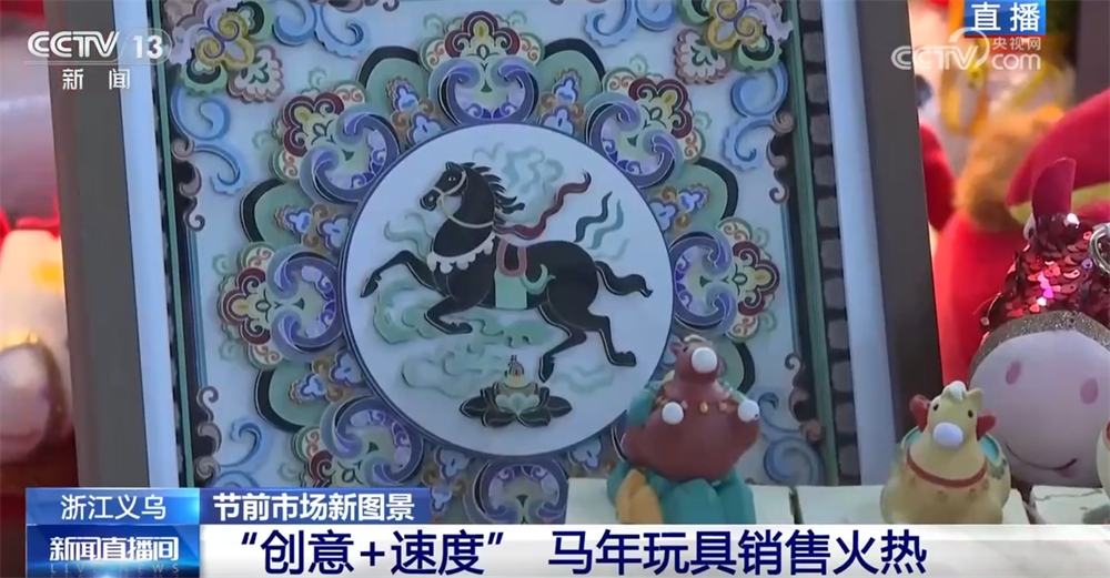 说完了抢抓商机的“哭哭马”,记者觉得今年的义乌会带给您全新的惊喜,一批以生肖马为灵感的“创意年味”加速奔向你。看这边,这款“马踏祥云”立体相框用上了敦煌风的配色,既保留了吉祥如意的老传统,又显得特别新潮。再看这些生肖马的小玩意儿,被设计成了盲盒、挂件、摆件……花样可多了!上面还印着实在又讨喜的字,年轻人一看就喜欢,买了不光自己用,还爱晒到朋友圈。