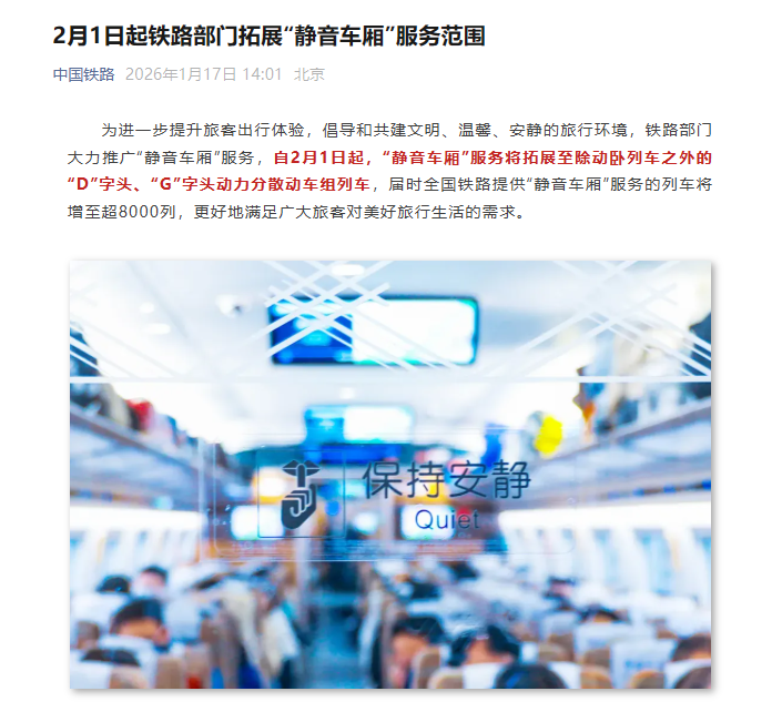 为进一步提升旅客出行体验,倡导和共建文明、温馨、安静的旅行环境,铁路部门大力推广“静音车厢”服务,自2月1日起,“静音车厢”服务将拓展至除动卧列车之外的“D”字头、“G”字头动力分散动车组列车,届时全国铁路提供“静音车厢”服务的列车将增至超8000列,更好地满足广大旅客对美好旅行生活的需求。