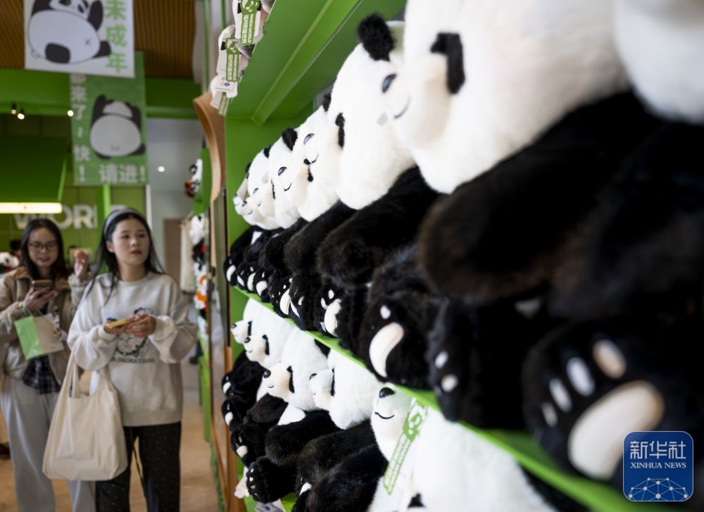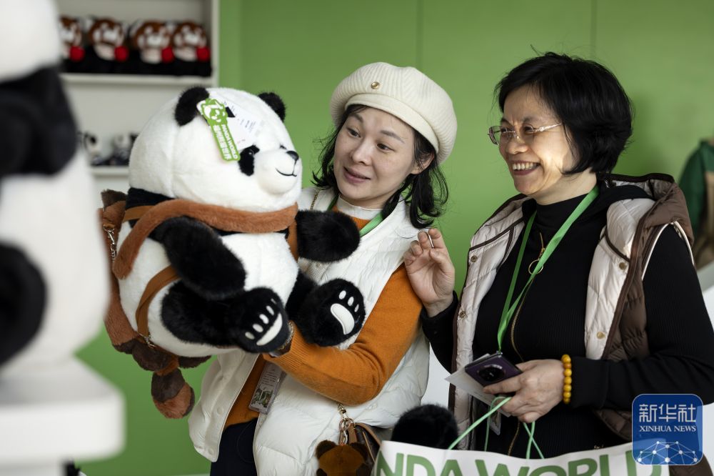 ↑ 1月17日,游客在文创售卖区选购大熊猫文创产品。