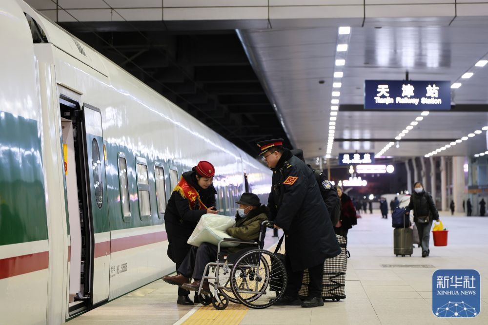 ↑ 1月19日,铁路工作人员在天津站服务重点旅客上车。