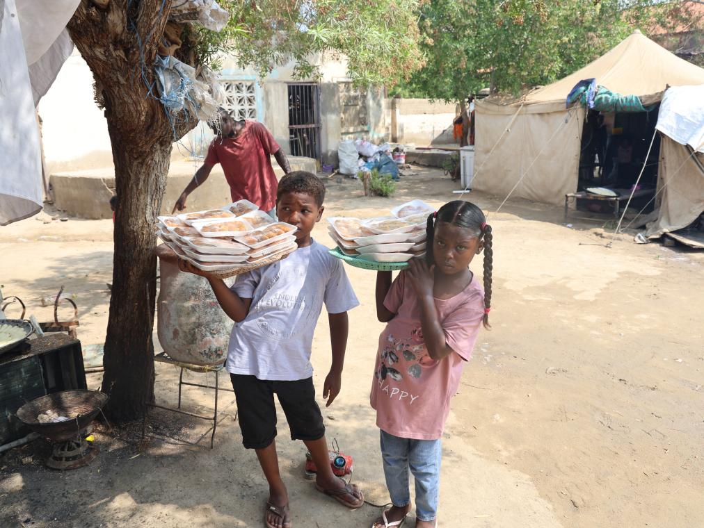 2024年11月12日,在苏丹东部城市苏丹港的一处流离失所者营地,两名儿童准备把制作好的食品拿到市场出售以换取收入。新华社发(法耶兹·扎基 摄)