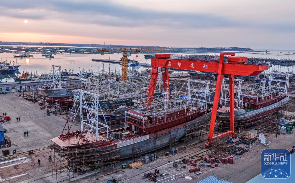 ↑1月28日,在山东省荣成市石岛管理区海工装备产业基地,船舶在维修中(无人机照片)。新华社发(李信君摄)
