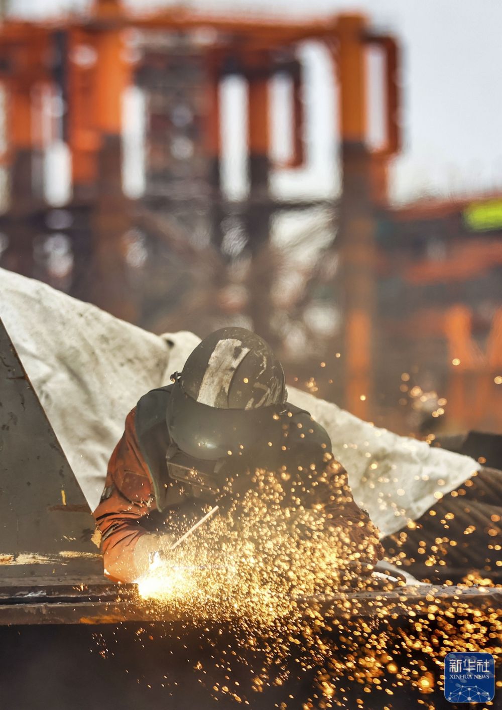 ↑1月29日,在天津市滨海新区,海上油气平台建设工人进行现场施工。新华社发(杜鹏辉摄)