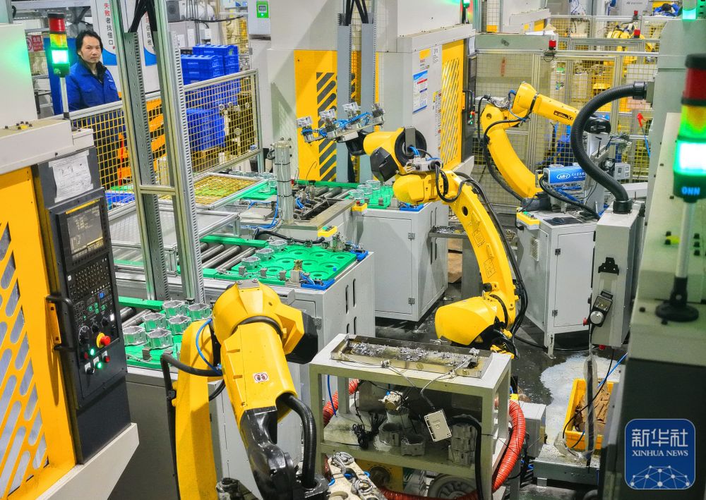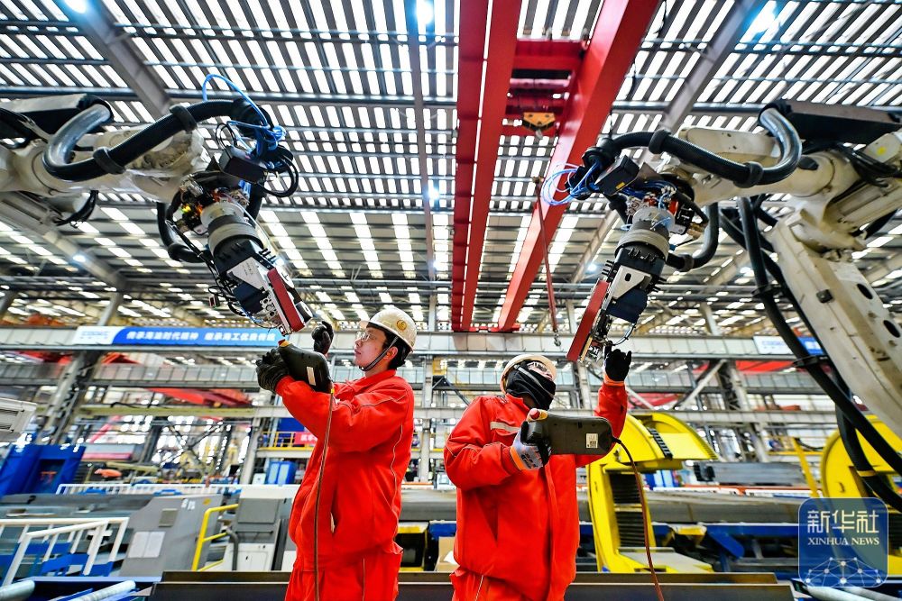 ↑1月29日,在天津市滨海新区,海上油气平台建设工人操作打磨机器人。新华社发(杜鹏辉摄)