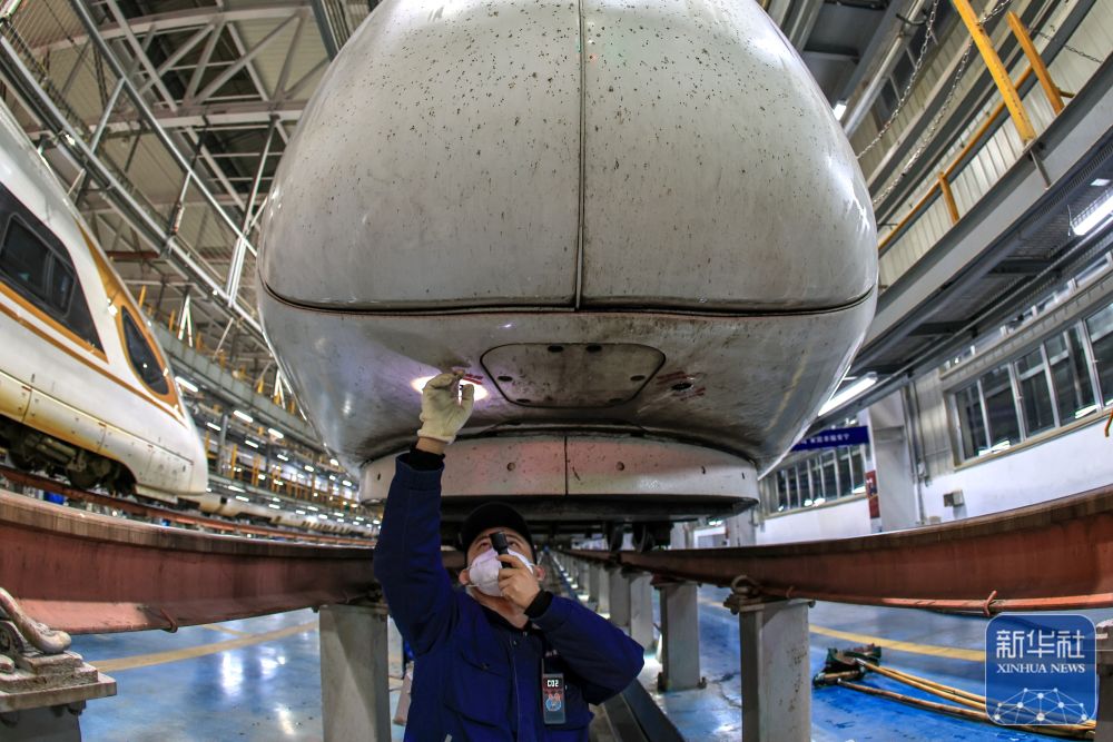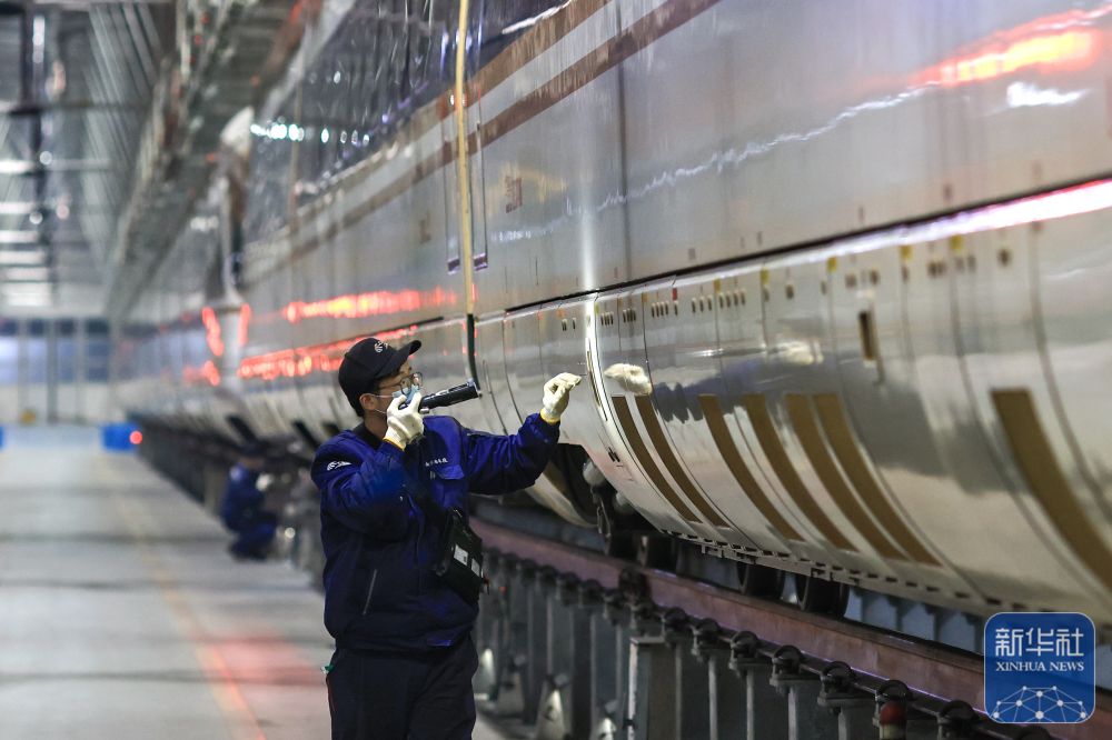 ↑1月28日凌晨,工作人员在南京南动车运用所检修动车组列车。新华社发(杨素平 摄)