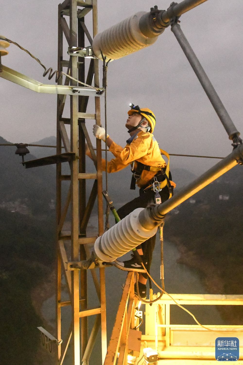 ↑1月29日,中国铁路南宁局集团有限公司接触网工在支柱顶部测量锚段关节的数据参数。新华社记者 张爱林 摄