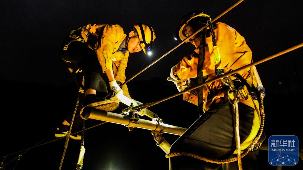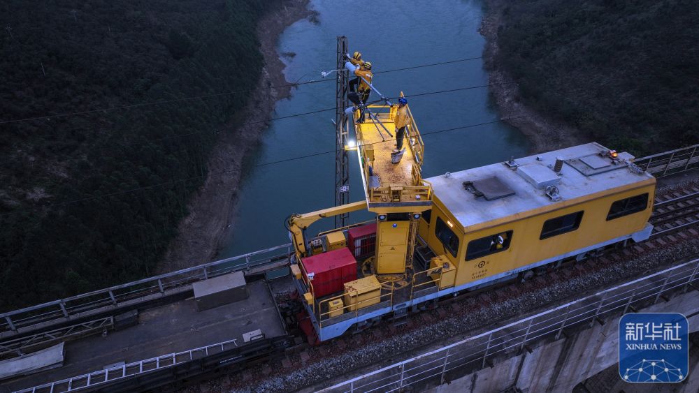 ↑1月29日,中国铁路南宁局集团有限公司南宁供电段的接触网工在南盘江铁路大桥上检修接触网设备。新华社记者 张爱林 摄