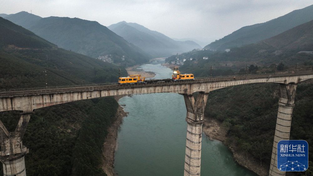 ↑1月29日,中国铁路南宁局集团有限公司南宁供电段的接触网工在对南盘江铁路大桥上的接触网设备进行维修作业。新华社记者 张爱林 摄