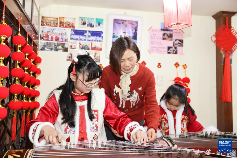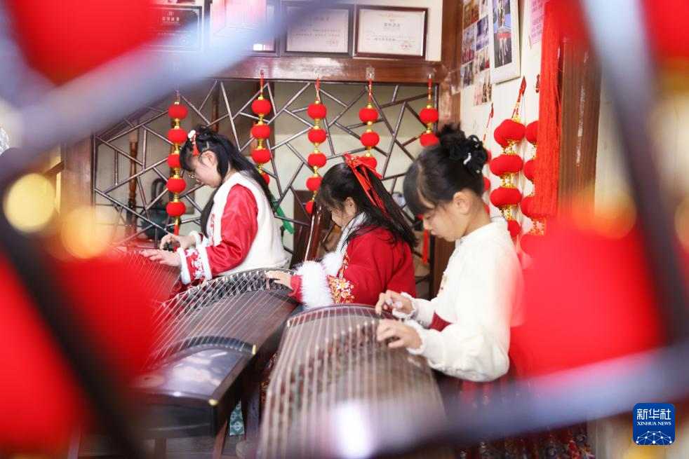 2月8日,孩子们在浙江省湖州市德清县乾元镇一家琴行练习弹古筝。新华社发(倪立芳 摄)