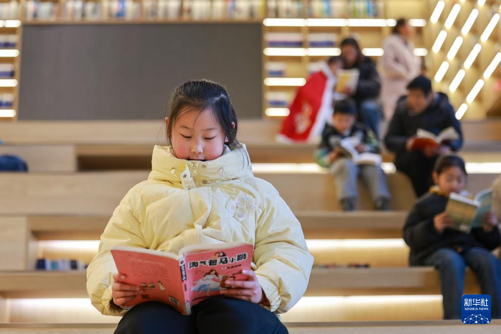 2月8日,江苏省泰兴市新时代文明实践中心羽惠书房内,小朋友在看书。新华社发(顾继红 摄)