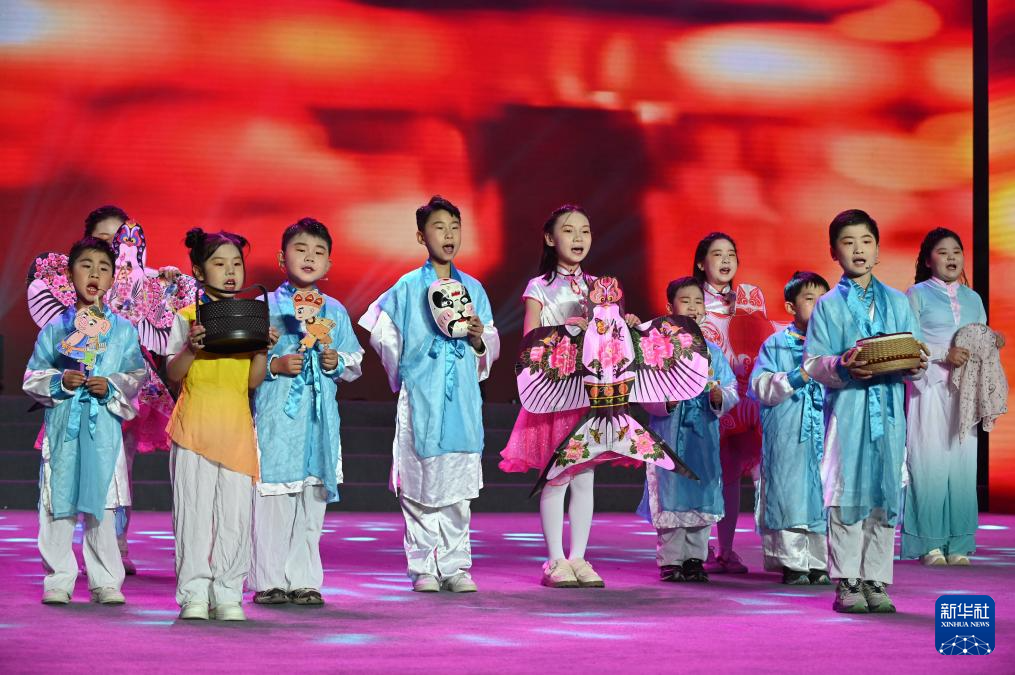 2月8日,在河南省沁阳市朱载堉音乐厅,小朋友们在“少儿春晚”上表演集体诗朗诵《非遗里的中国》。新华社发(杨帆 摄)
