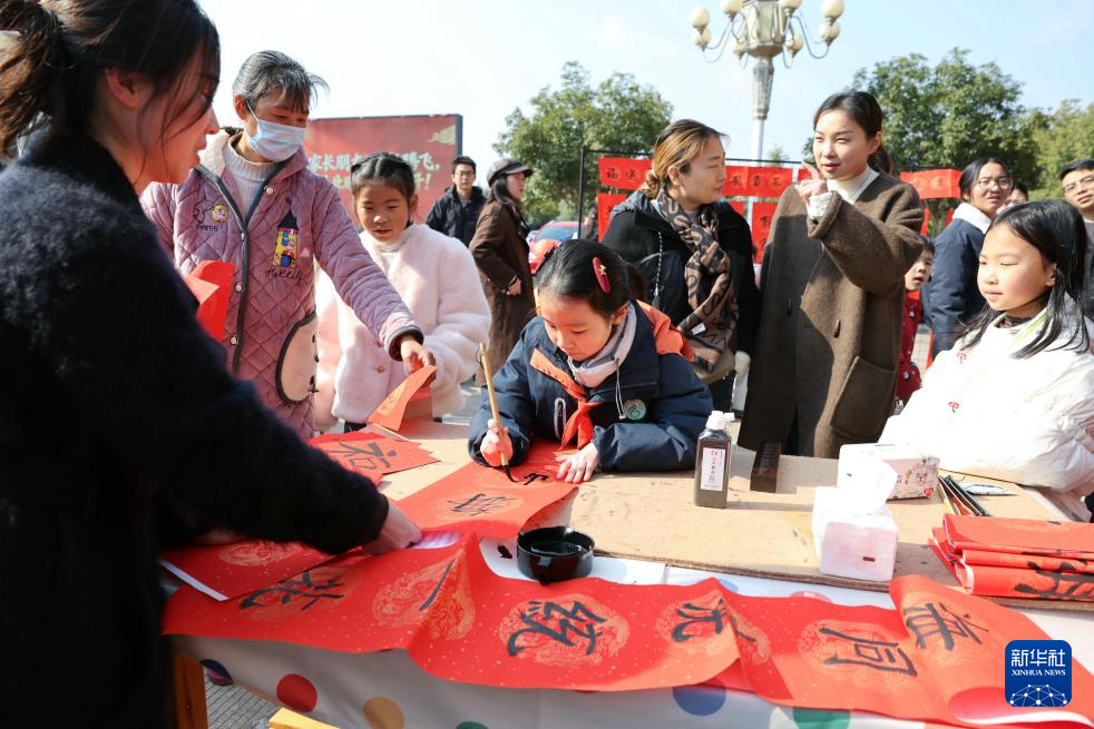 2月8日,在浙江省东阳市花园外国语学校小学部,书法俱乐部的学生在写春联。新华社发(包康轩 摄)