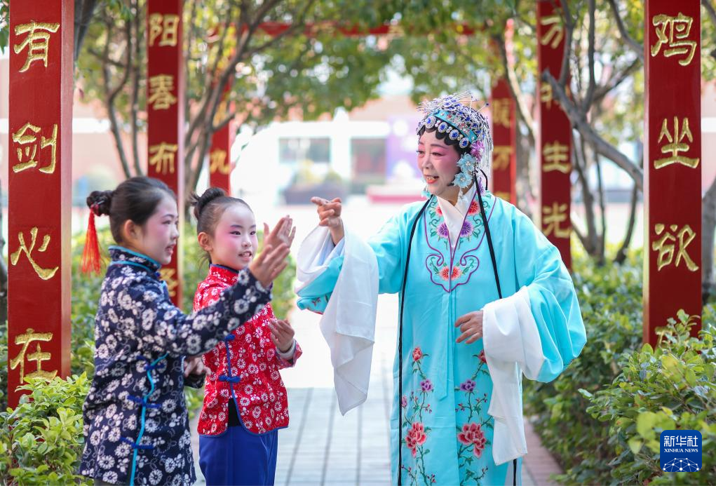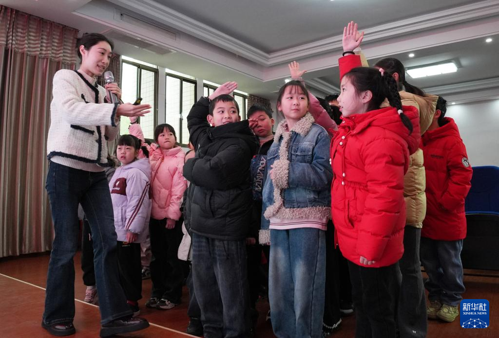 2月8日,在江苏省泰州市姜堰区城西学校教育集团城西小学校区公益寒托班上,戏曲老师指导学生练习戏曲基本动作。新华社发(周社根 摄)