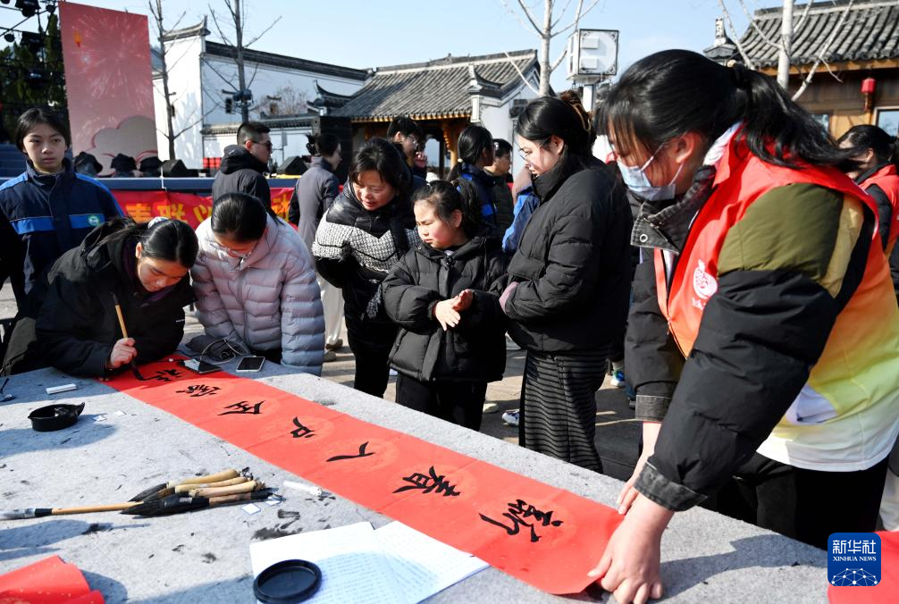2月8日,学生志愿者(右)在江苏省海安市政协书画联谊会送福字、赠春联文化惠民活动现场整理书法作品。新华社发(顾彬斌 摄)