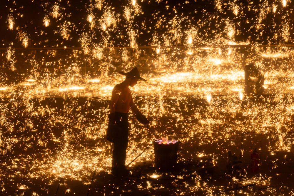近日,首届“浦东中国年味节”在上海市浦东新区黄浦江畔举行,非遗“打铁花”成为夜色中一道亮丽的风景线。