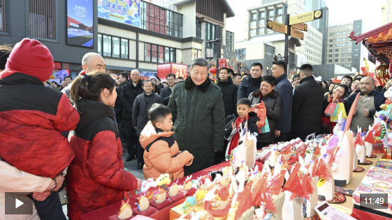 总书记察看街区风貌和各式年货摊位,同现场群众亲切交流。他愉快地向大家讲起年少时多次到隆福寺的情景,还购买了特色食品和文创产品。