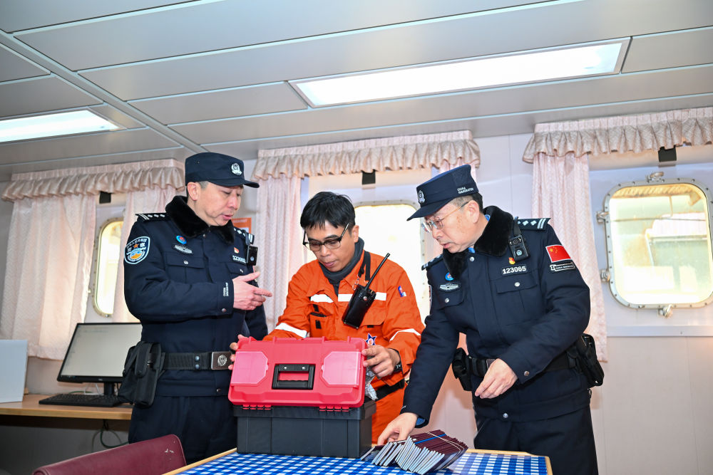 ↑2月11日,天津东疆边检站民警登船为载有生鲜产品的船舶船员办理手续。