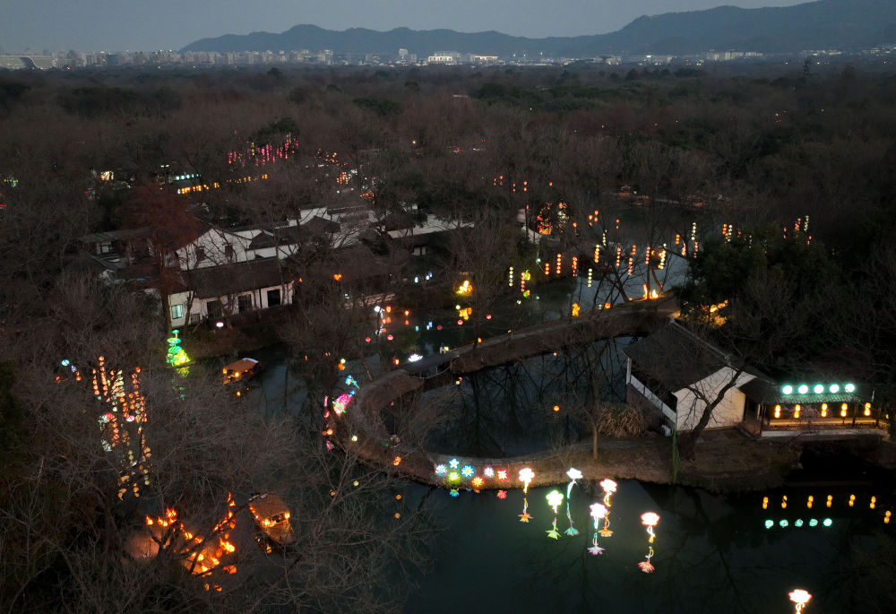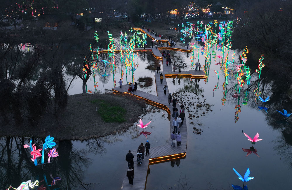 2月11日,浙江省杭州市西溪湿地开启2026年西溪灯会,千余盏花灯组成十余个赏灯场景,烘托传统年俗氛围。